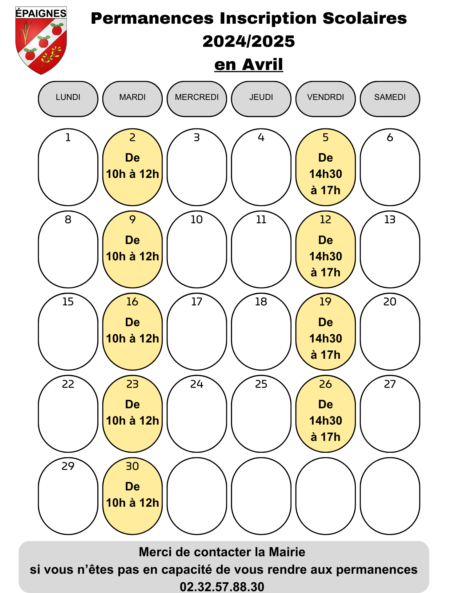 les Inscriptions Scolaires 2024/2025 se feront en Mairie sur les jours de permanence suivant :